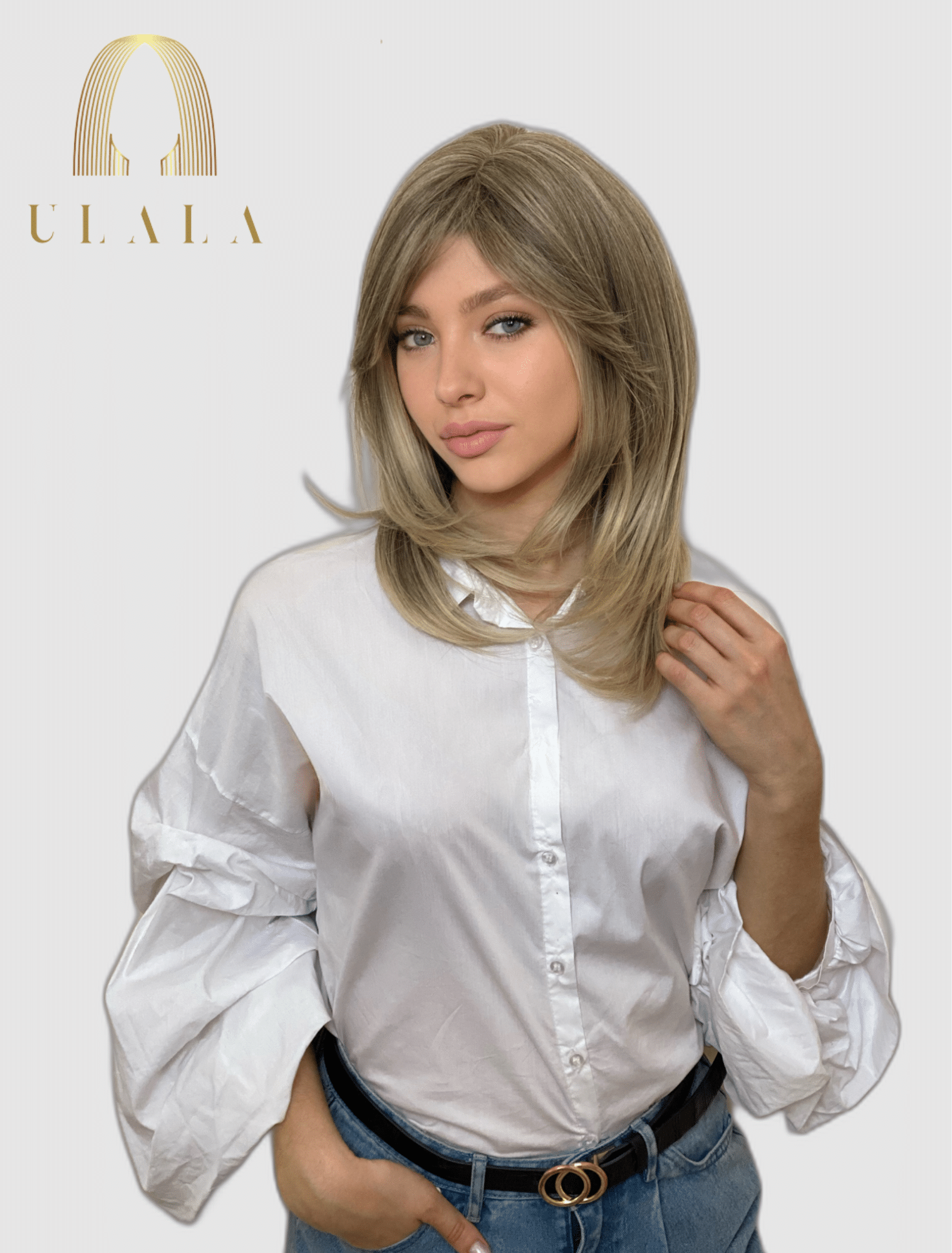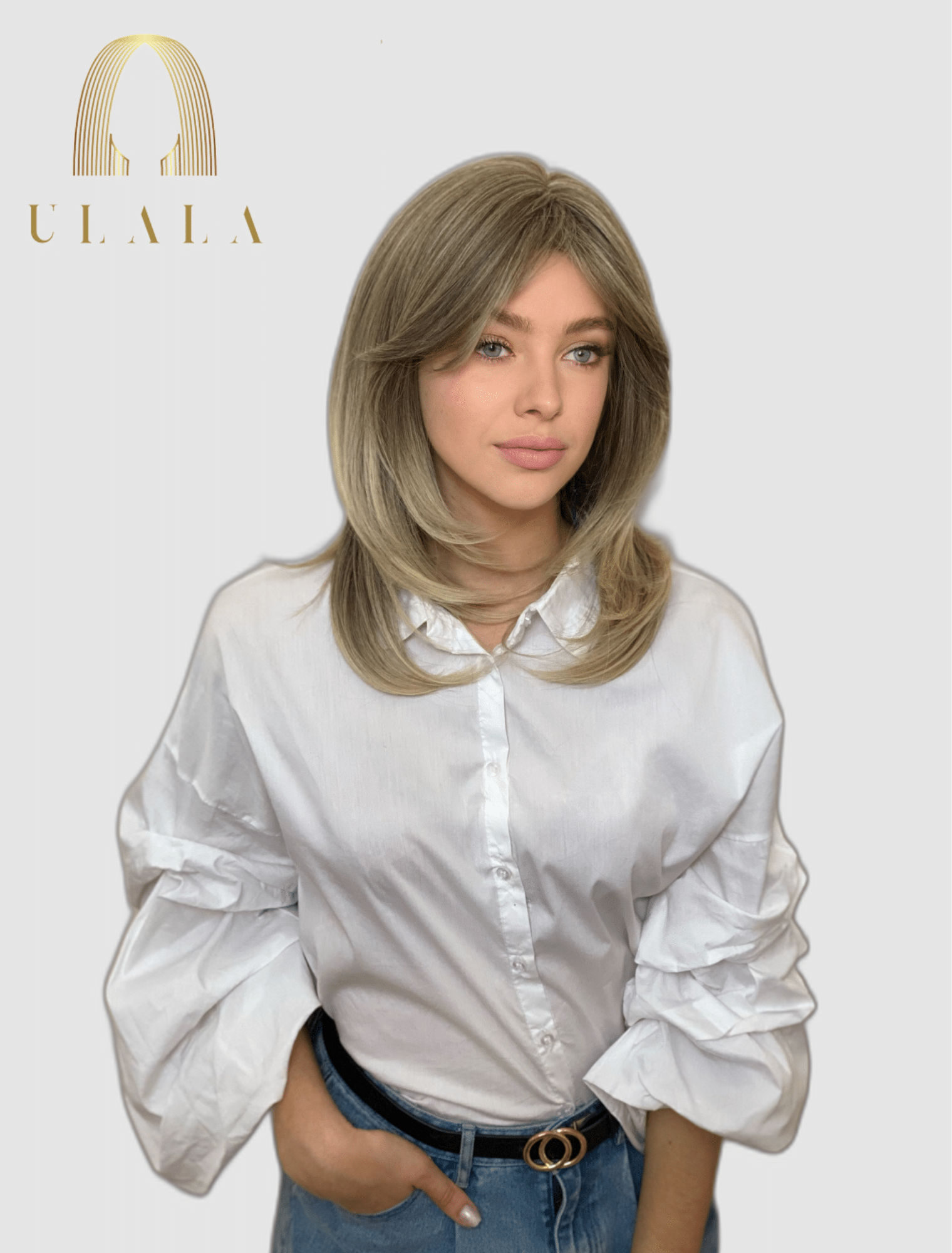 • Szín: Természetes hamvas szőke, világos szőkével tincsezve a hajvégek irányába (balayage/ombre – akár a képen)